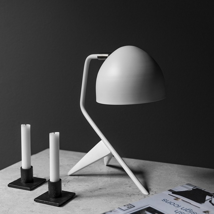 Studio 1 - Bordlampe i metal (hvid).Studio-bordlampen fra Klassik Studio kombinerer et elegant formsprog med en varm, indbydende atmosfære. Den justerbare skærm lader dig rette lyset efter behov, mens den rå messing på indersiden tilfører et hyggeligt, gyldent skær. Fås i flere farver, så du nemt kan finde den variant, der passer til netop din stil.Lad Studio ska