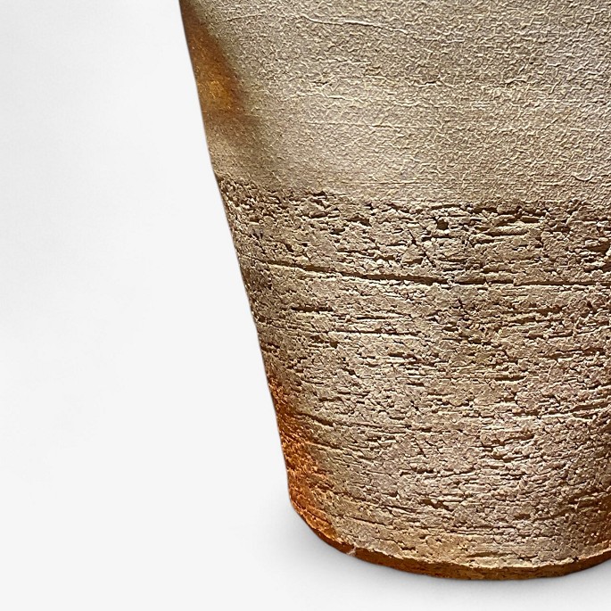 Stor gulvvase i rakubrændt stentøj med jordlige nuancer.