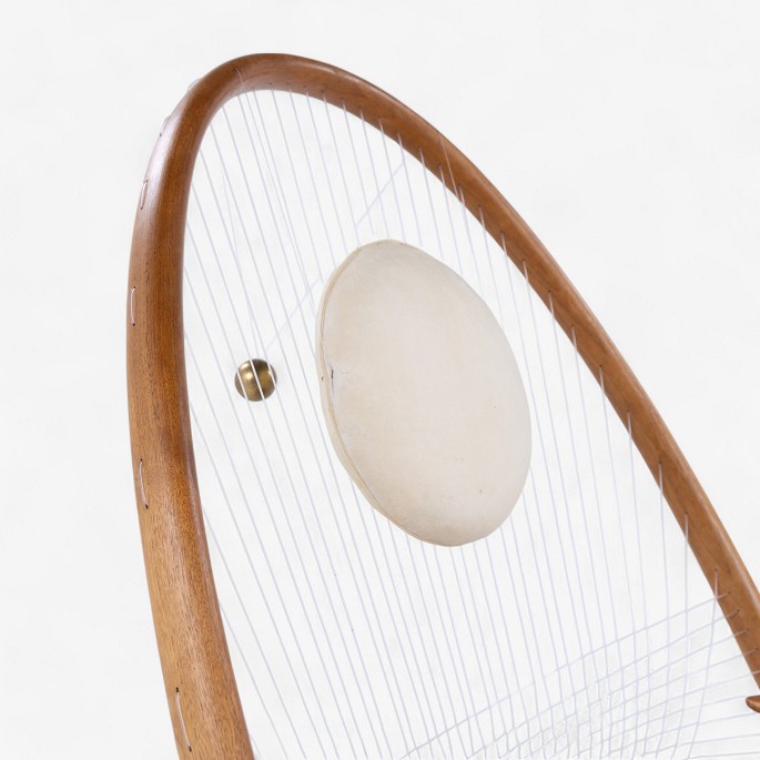 Sjælden lænestol i nøddetræ, nylon, originalt lædersæde og patineret pergament nakkehynde. Formgivet i 1955.