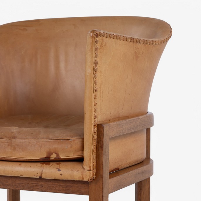 MK 51 - 'Kaminstol' i mahogni og patineret naturlæder. Formgivet i 1936. Mærket fra producent.