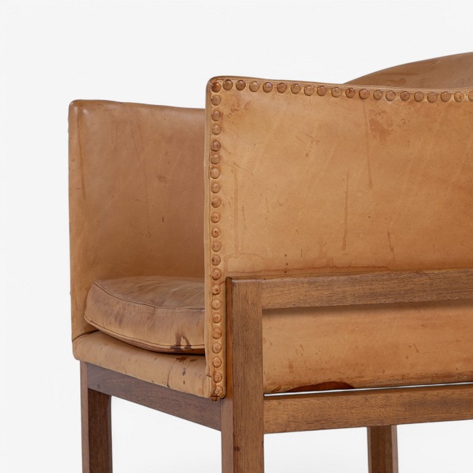 MK 51 - 'Kaminstol' i mahogni og patineret naturlæder. Formgivet i 1936. Mærket fra producent.