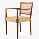 Spillebordssæt med spillebord og fire tilhørende armstole i mahogni og nyt sæde af tekstil (RØMØ, farve 67-111/104).