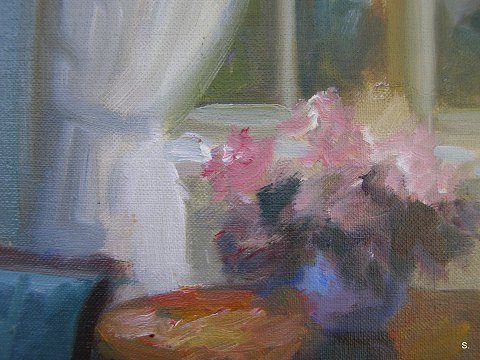 Edith Gert Interiør med kvinde der syr sign. E Gert