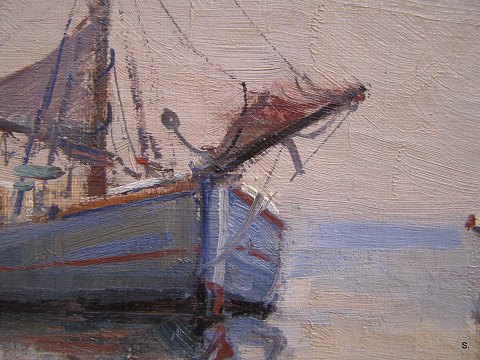 SOLGT. Både ud for kyst sign. V. Bang. C. ubekendt kunstner 47,5*37,5 cm. med ramme 61*51 cm. Emne nummer: 11474