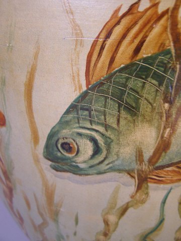 En stor gulvvase af lertøj, bemalet med søbund og fisk, h:49