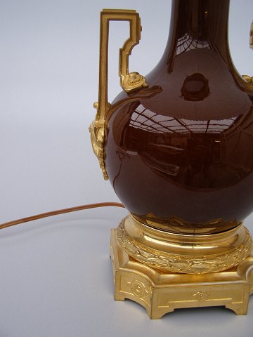 Fransk bordlampe af porcelæn med påsat broncemontering, h:64cm. med skærm