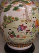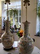 Et par store bordlamper på stand af træ, bemalet med figurer, H: 58cm. der er desværre en brændingsfejl som det fremgår af billeder