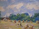 Landskab med høstet kornmark og gård i baggrunden. Sign. A Naur 67*87 cm. med ramme 86*106 cm.
