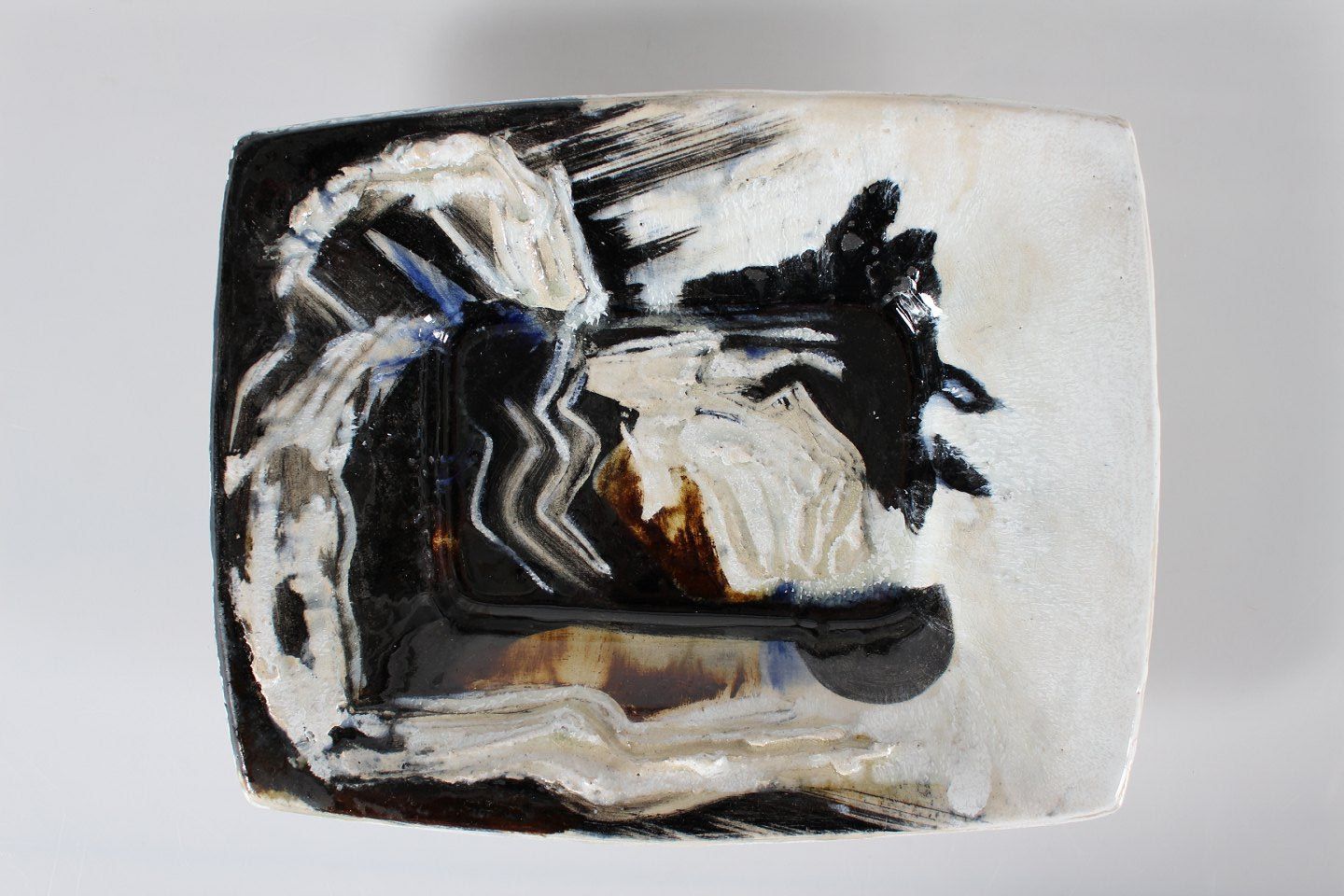 Jeppe Hagedorn-Olesen Ceramic dish with abstract composition in white, beige, black, brown and blue glaze Height 5 cm Width 27 cm Length 34 cm Signed Jeppe Hagedorn-Olsen Nice used condition - see image of small chip
