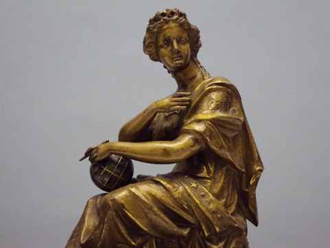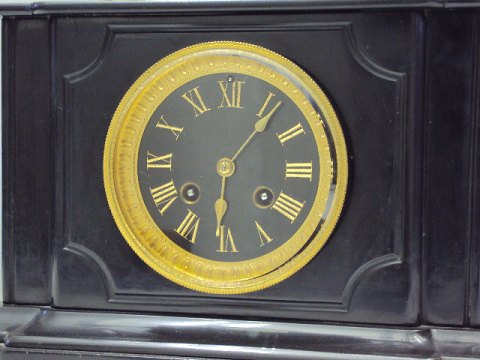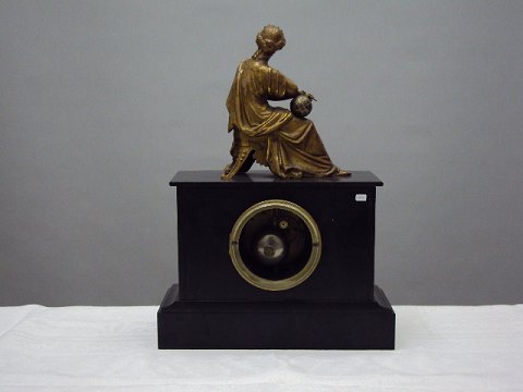 Gammel fransk taffelur af sort marmor - figur af forgyldt metal Højde 43 cm Uret er funktionsdygtigt Kan beses efter aftale