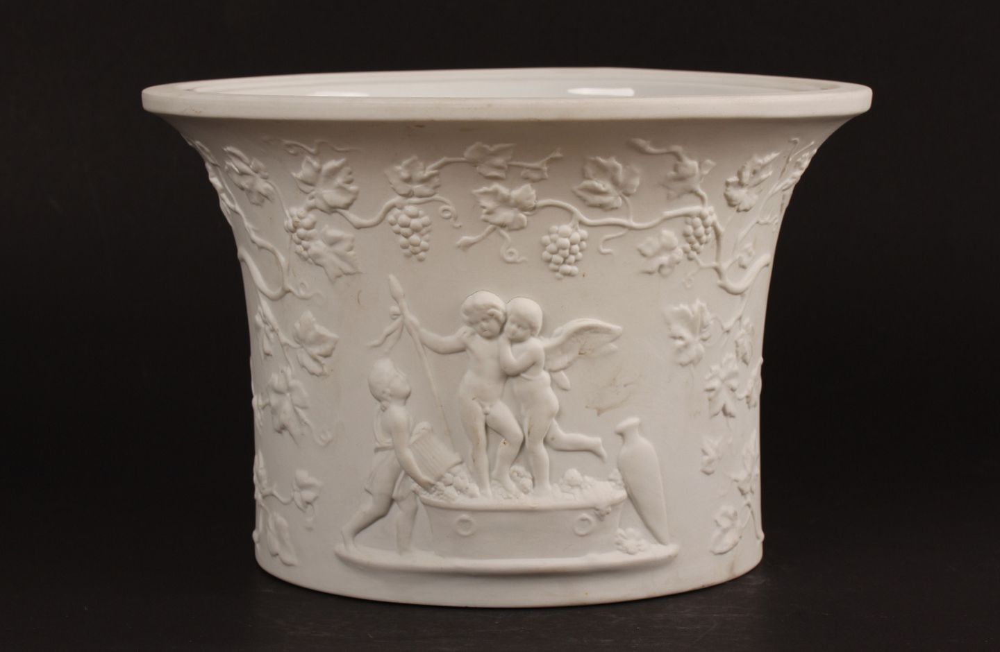 Bing & Grøndahl Vinkøler nr. 6112 af hvid biscuit Dekoreret med Bacchus, amoriner og putti efter Bertel Thorvaldsen Diameter 23 cm - højde 15,5 cm Fin fejlfri 1. sortering