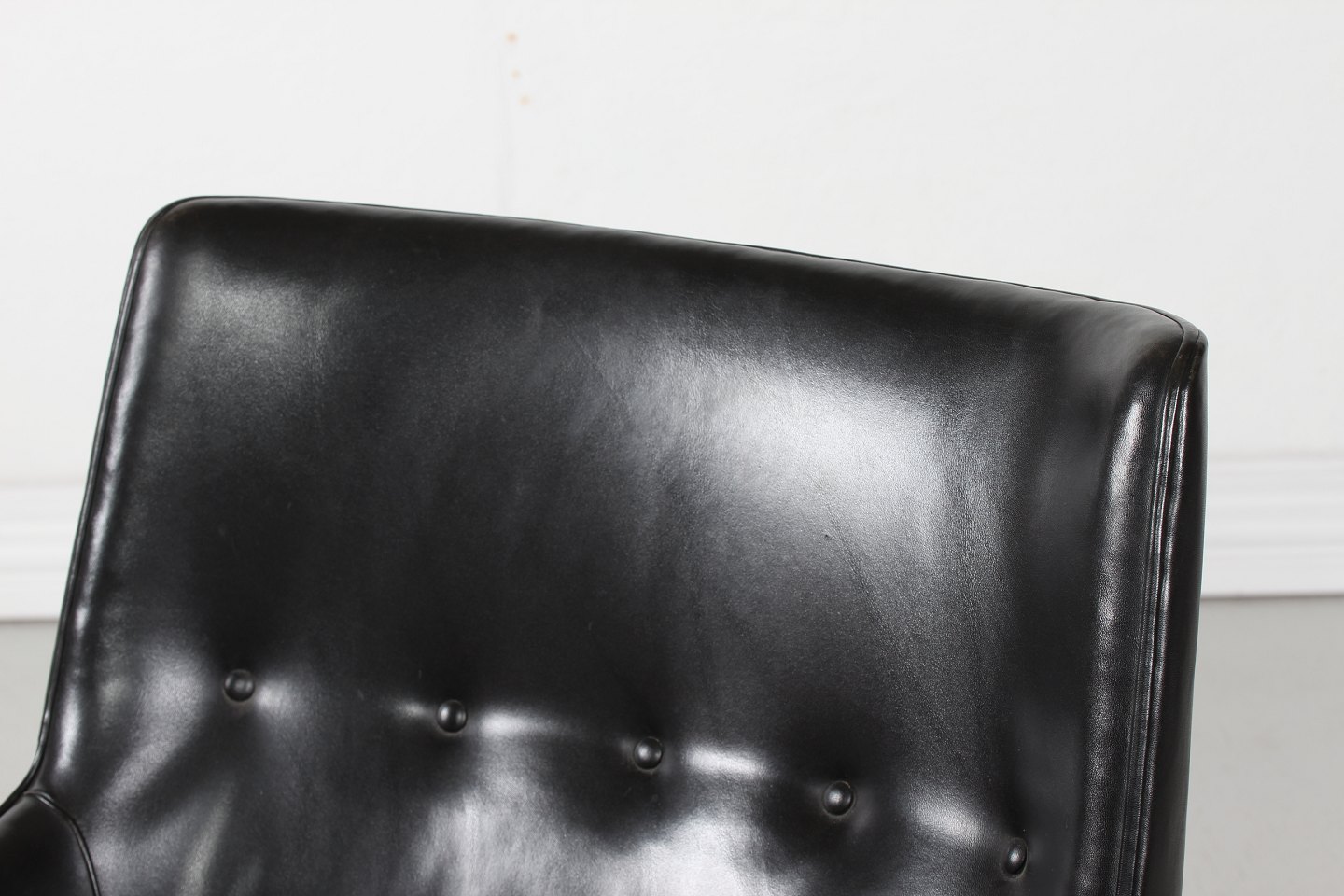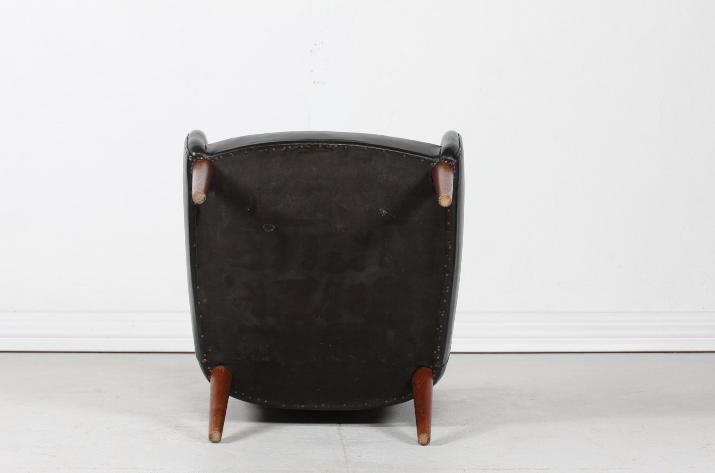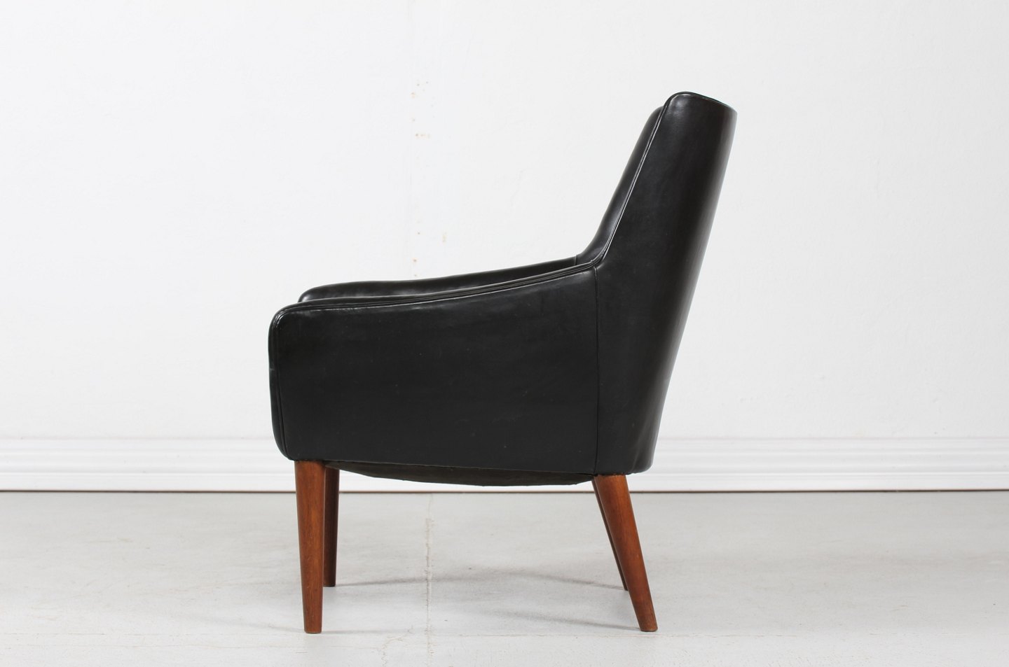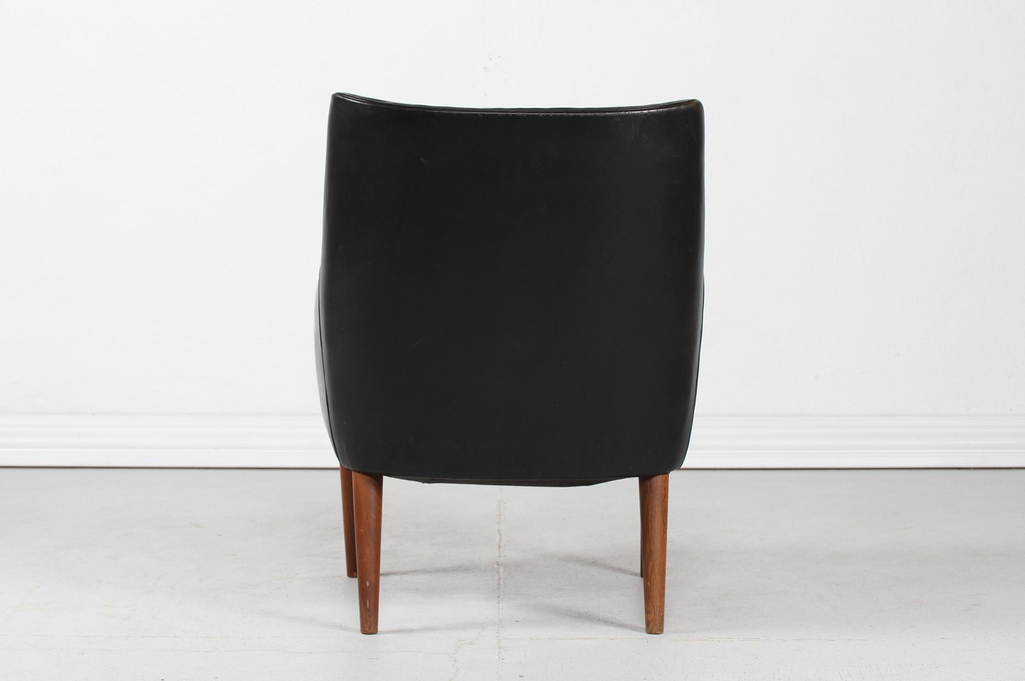 Dansk Møbeldesign Lille 1950'er lænestol betrukket med sort skai og ben af træ Dansk Møbelproducent Højde 80 cm Bredde 62 cm Dybde 74 cm Sædehøjde 39 cm Fin stand uden huller Stolen kan beses efter aftale