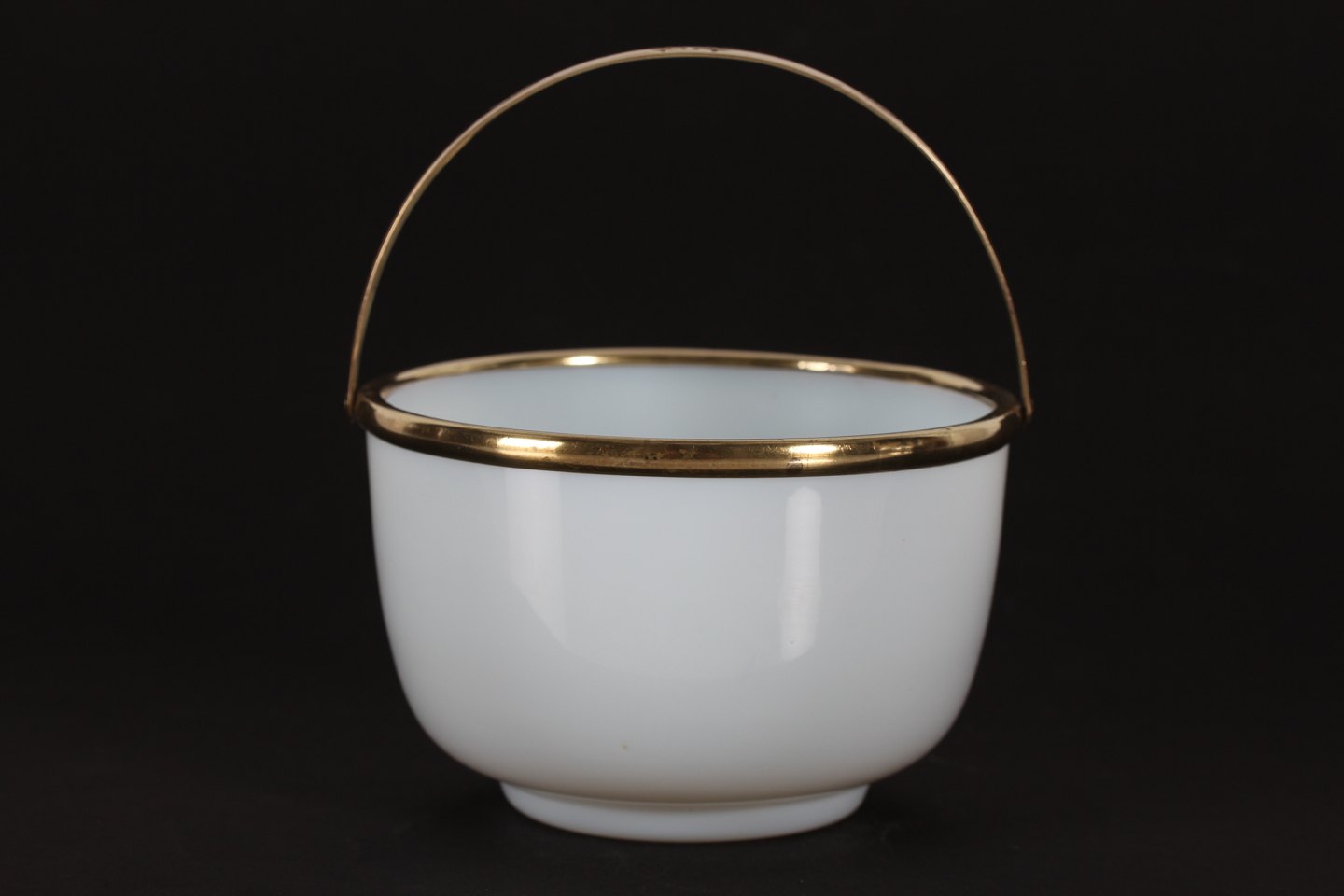 Danish Glasswork Old danish sugar bowl with handle of brass made of milk white glass Height incl. handle 14 cm Diameter 11.5 cm Nice condition - no chips or cracks