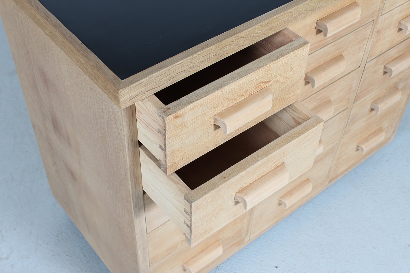 Danish Modern Merchant desk with 15 drawers made of oak, solid and veneer. With black desk top and handles of light colored wood Height 86 cm Length 104 cm Depth 52 cm Danish Manufacturer Nice vintage condition