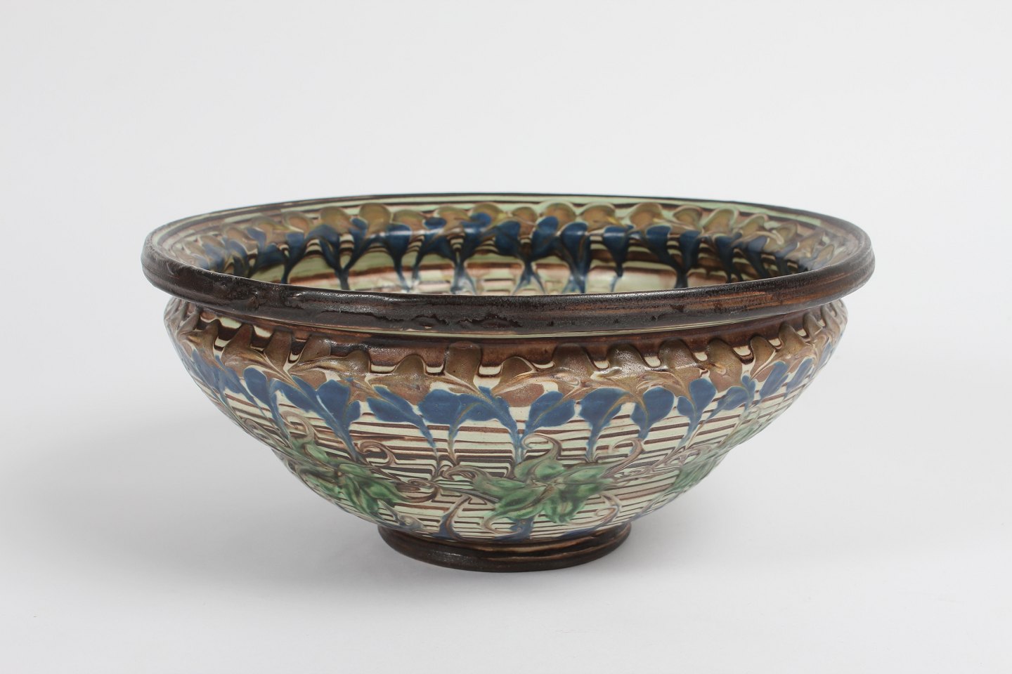 Herman A. Kähler Large ceramic bowl decorated with multicolored glaze by Jens Thirslund in the1930s Sign. HAK + Danmark Height 12 cm Diameter 28 cm Very nice vintage condition - without chips, cracks or repair