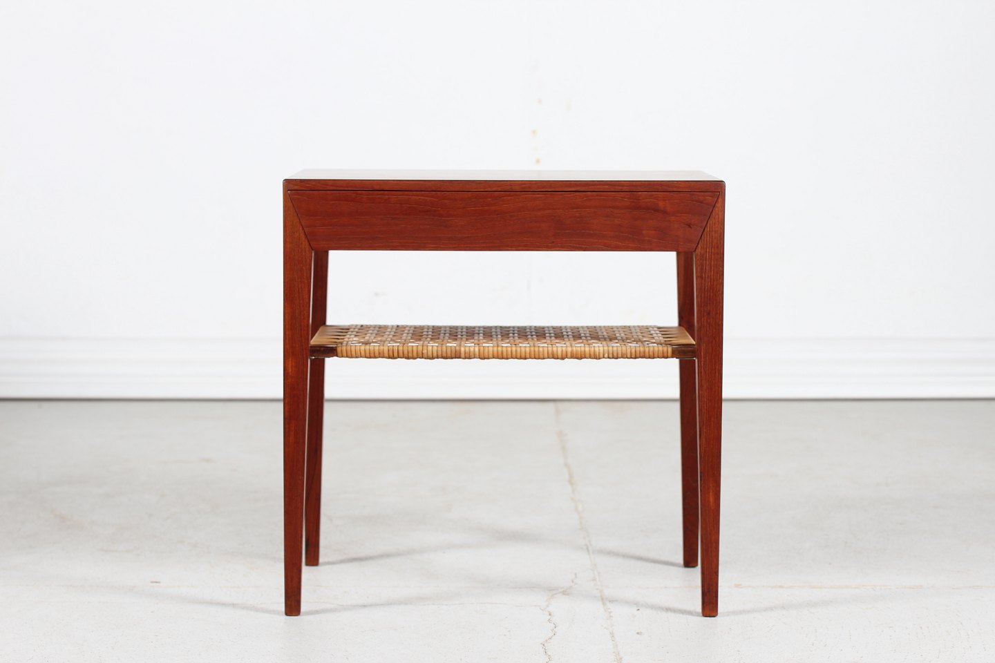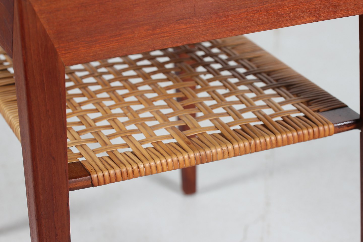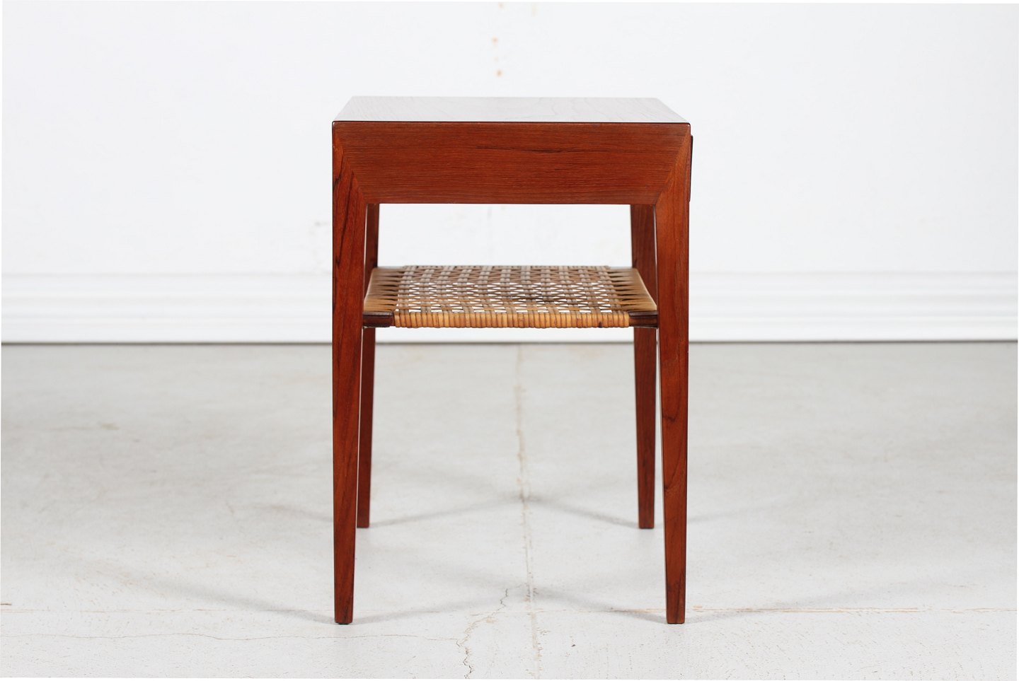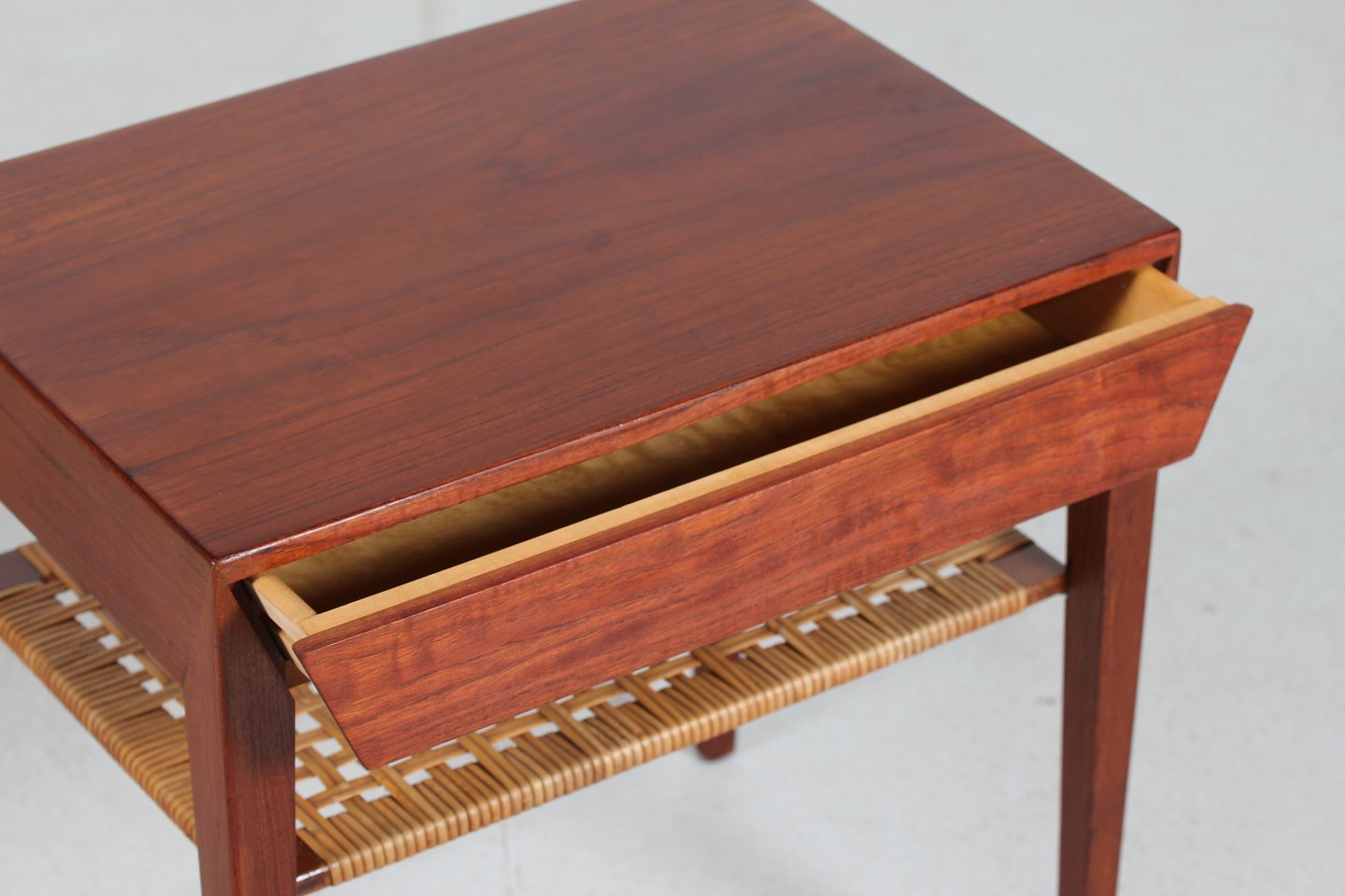 Severin Hansen Jr. Side table made of teak with pointed legs. 1 drawer and a cane magazine shelf. Manufacturer: Haslev Møbler Length 58 cm Width 35 cm Height 50 cm Nice vintage condition