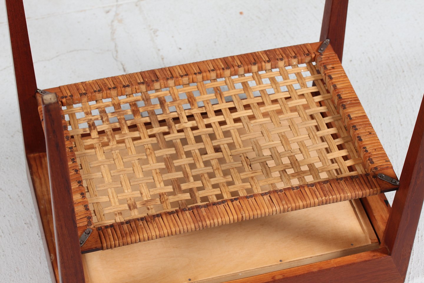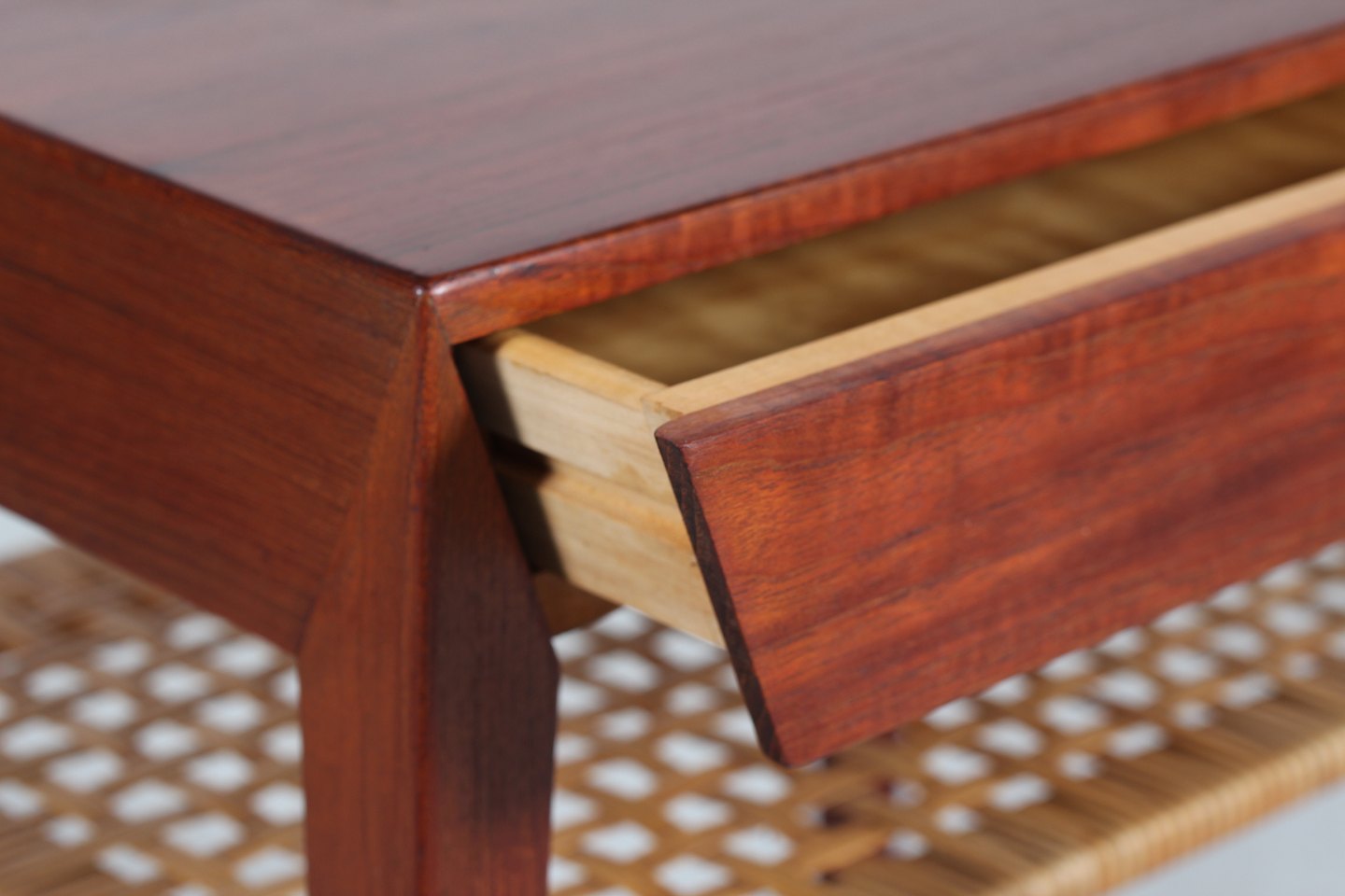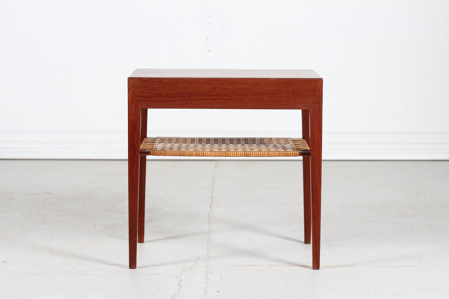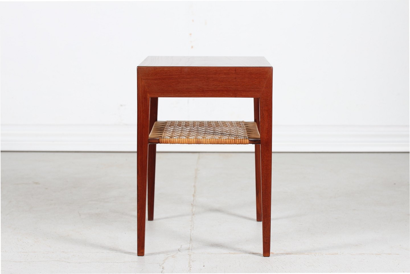 Severin Hansen Jr. Side table made of teak with pointed legs. 1 drawer and a cane magazine shelf. Manufacturer: Haslev Møbler Length 58 cm Width 35 cm Height 50 cm Nice vintage condition
