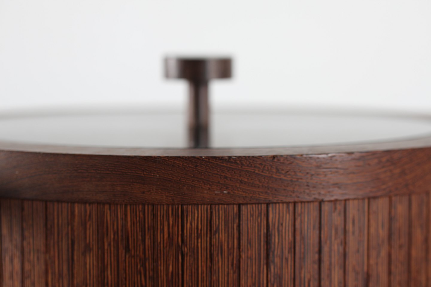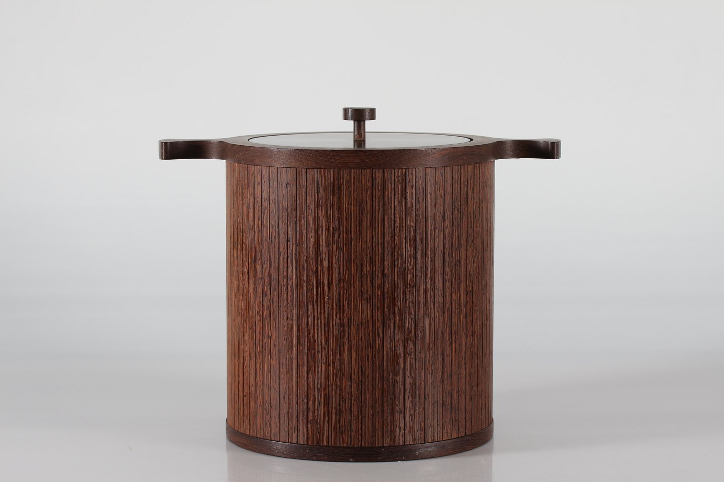 Theodor Skjøde Knudsen (1927-2007) King size isspand med låg og indsats af sort og hvid plast, fremstillet af wengé Stemplet: Skjøde Denmark Diameter 25 cm Højde 31 cm Fin stand