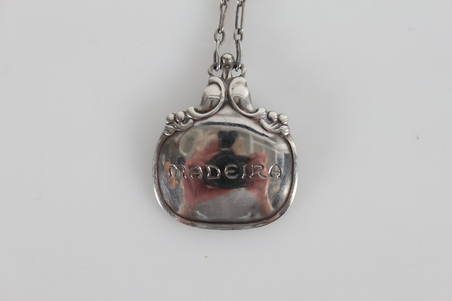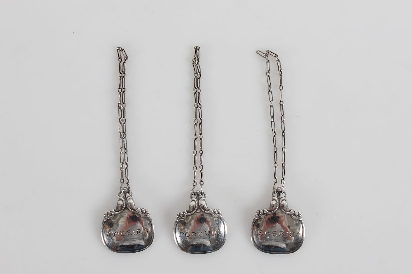 Georg Jensen 3 decanter labels made of sterling silver Engraved: Portvin, Sherry and Madeira Length with chain 8 cm Nice vintage condition