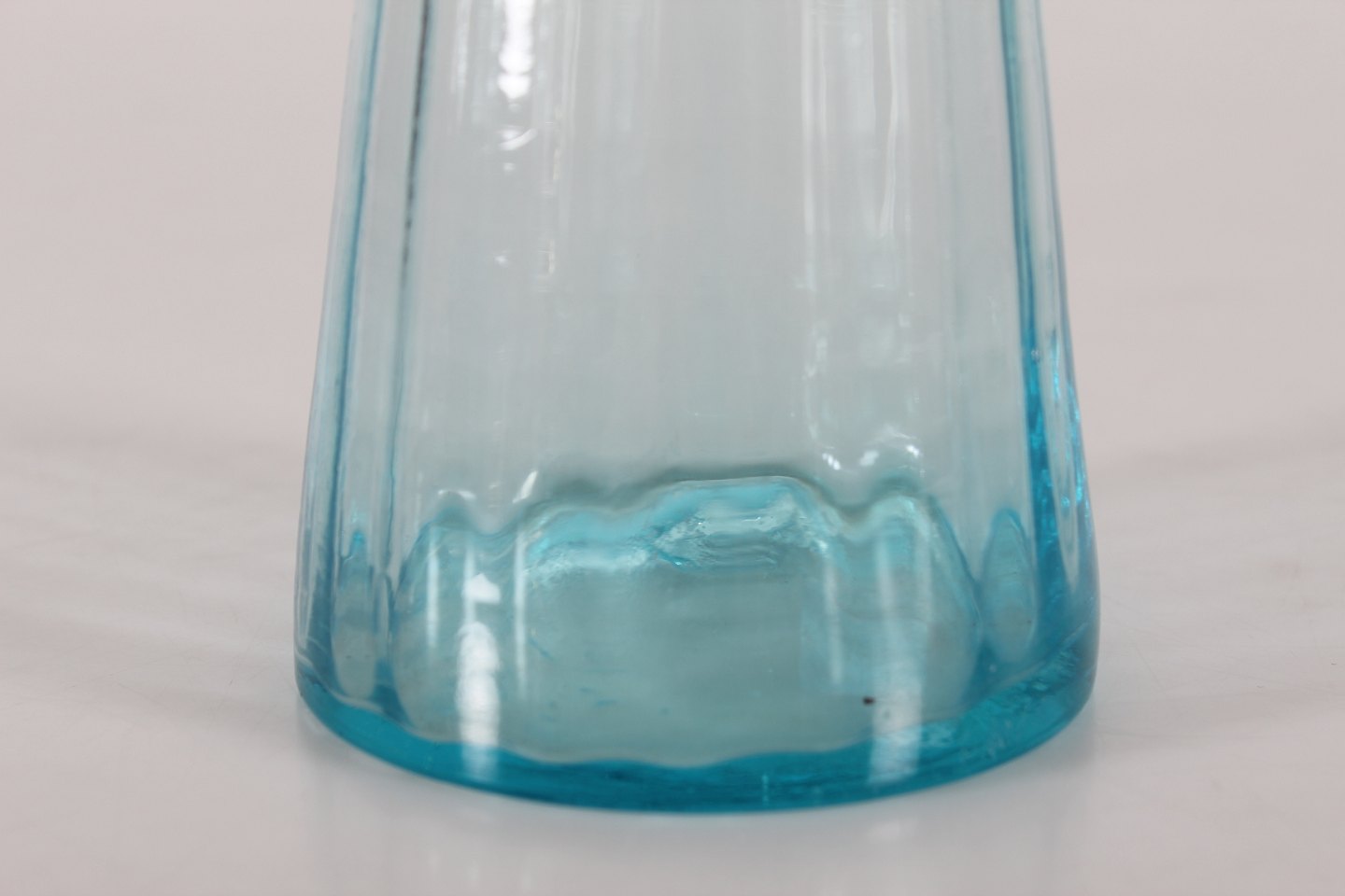 Gammel dansk akvamarinblåt hyacintglas i let vreden form