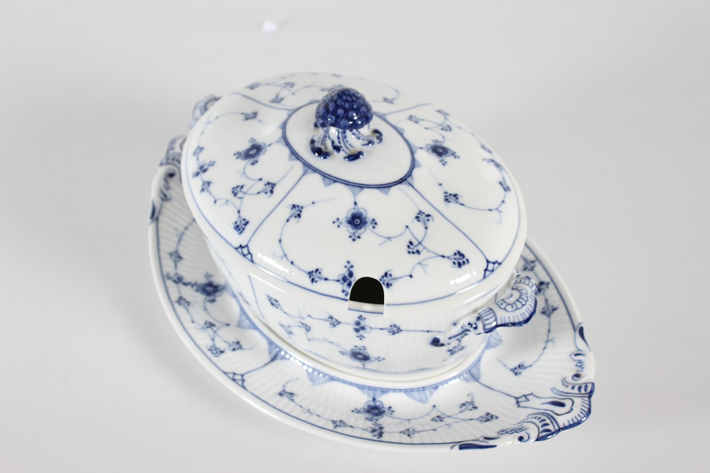 Royal Copenhagen Blue Fluted Plain Old tureen with dish model no. 1/214 With stamp from the period 1893-1900 Length 40 cm Height 21 cm 1.quality - mint condition