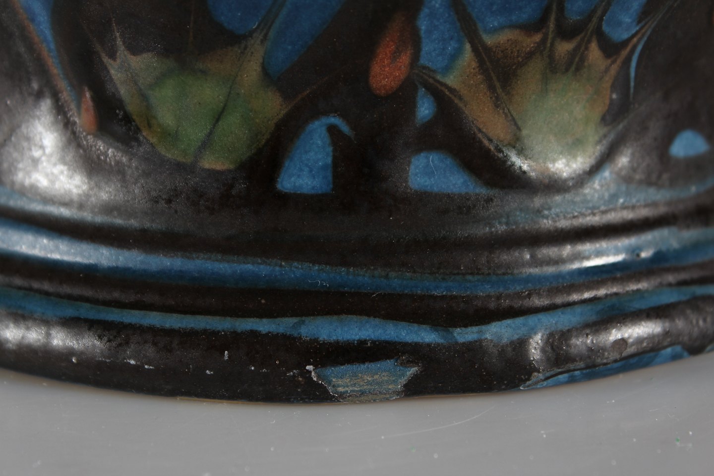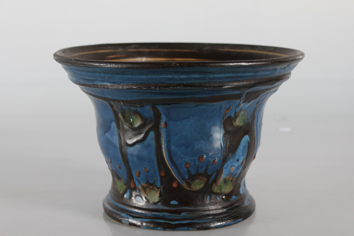 Herman A. Kähler Flowerpot with dark blue, green, black and rust red glaze Sign. HAK + Danmark Height 17 cm Diameter 26 cm Nice vintage condition - see images of small chips