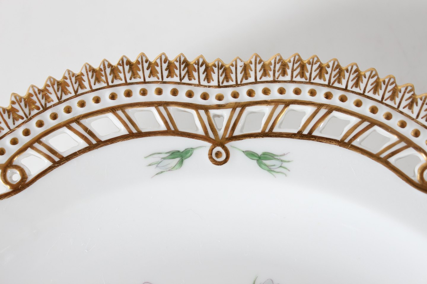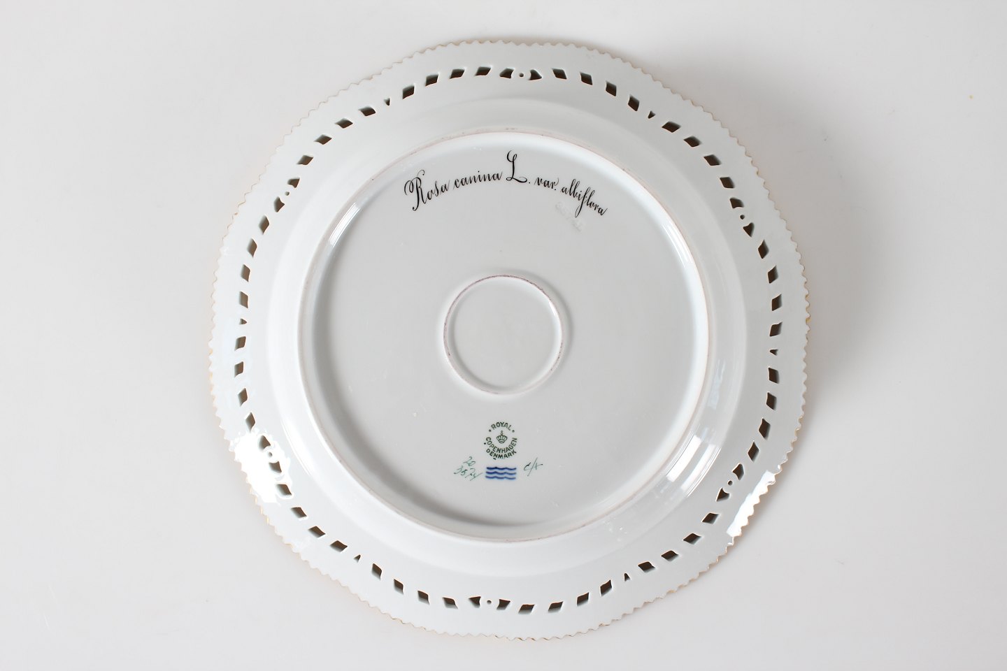 Royal Copenhagen Flora Danica Rundt fad nr. 20/3574 m/takket og gennembrudt blondekant Dekoreret med blomst "Rosa canina L. var albiflora" og stempel fra 1957 Diameter 28,5 cm 1. sortering, meget fin stand