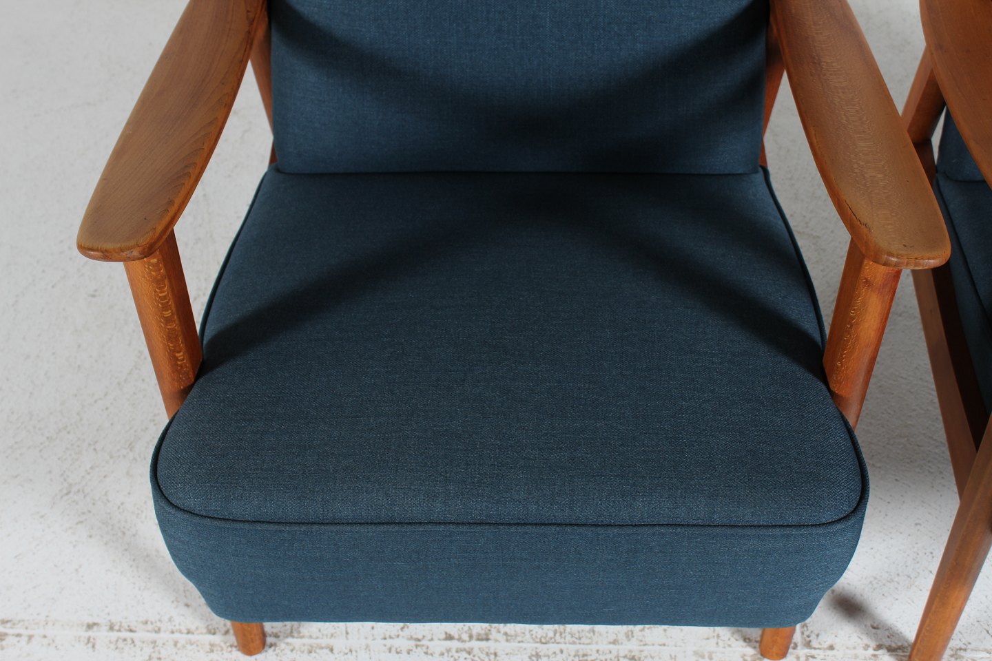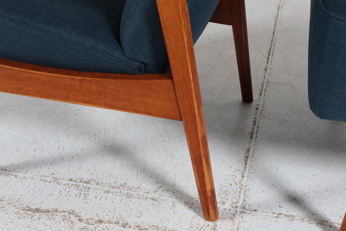 Fritz Hansen A/S Par lænestole af teak farvet bøg betrukket med blåt betræk. Producent: Fritz Hansen A/S Mål: Højde 83/46 cm Bredde 66 cm Dybde 82 cm Fin stand med nyere betræk og god fasthed
