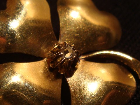 Brooch by leaf clover gold leaf 14k 585 adorned with diamond in the middle. 0.03 ct (H.F) Holger Fischer Copenhagen years. 1893-1937.