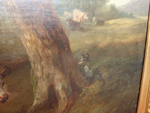 Old English Painting in Beautiful Frame Cows graze in the forest. while the shepherd sleeps under the tree. time calms owned by Shiels schelchau Mark. (kollerup Gods).