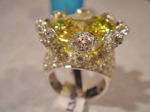 Ring. med Stor Gul krystal , siderne omkranset med talrige slebne krystaller.
