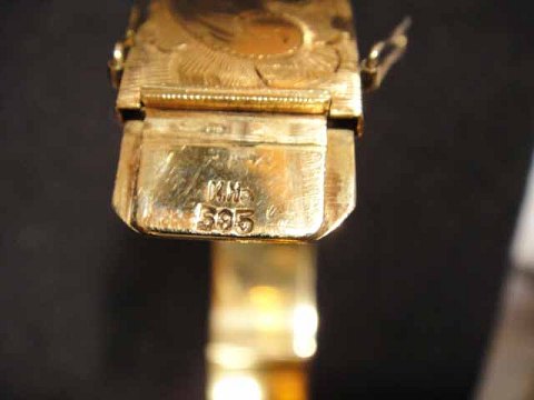 Bracelet with 3 tyrkiser. 14k Gold 585 K.Ha (Fir. Hassing Goldsmith - Hjørring 1971 to 1990). Weight: 29.4 g. Width: 1.5 cm, thickness: 2.5 mm. inner diameter: 5.7 cm. The bangle is polished and in good condition.