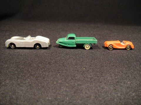 3 plastik biler miniature. Rød bil: kr. 125,- grønd bil kr. solgt Grå Bil. 75,-