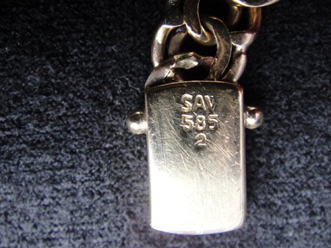 俾斯麦手链。 14K金585 长度。 20厘米宽度:8毫米 重量:13.5克。 制造商的标志:锯(细环工作斯坎迪亚 - 1953年霍恩拜克,至1982年) 售价USD。 639 ,-