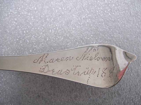 Denne spiseske dateret 1764 med Gravering S.P.S - A.P.D 1764. på Bagsiden.
