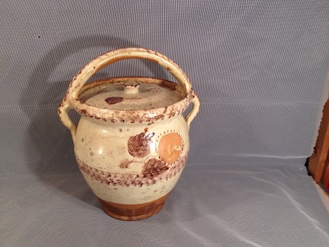 fremstår i pæn stand dog med enkelte glasurafslag på kanten af låg og kanten af potten hvor låget sættes ind.