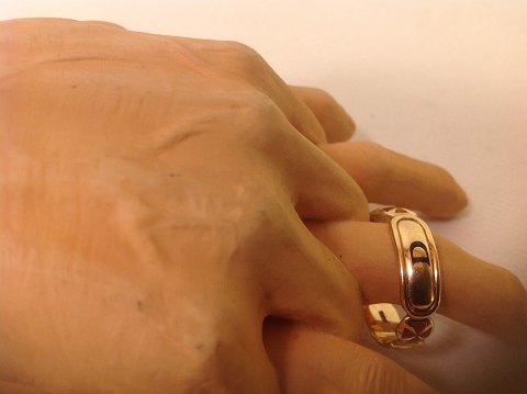 En flot kraftig VIII-grads ring der holder livet ud. 7 mm bred og med indlæg af ægte emalje i mørkeblåt og rødt. Ringene er meget kraftige og står stramt og flot. (De er i en helt anden klasse end hvad der normalt ses i denne type ringe).