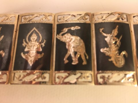 med oxyderet sølv og motiver af Buddha , Tempel danserinder og elefanter.