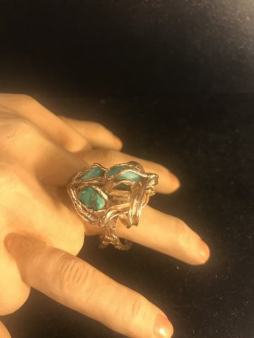 Large unique Gold ring with Turquoise. Gold 14 carat. With 3 turquoises. Ring size: 53.5 Weight: 15 grams. Length of ring crown,: 2.7 cm. Width: 2.2 cm. Height from ring rail 1.4 cm. Master stamp: HS (H.Siersbøl). Newly polished and nice ring.