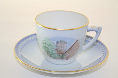 Danmarkstellet, Bing & Grøndahl, kaffekop med underkop med hulbort. Dekorationsnr. 305. Højde 6,5 cm. Forskellige motiver: