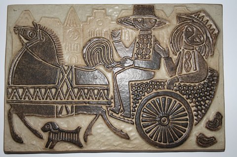 Michael Andersen, Bornholm. Stentøj vægrelief med brun mat glasur. Motiv hestevogn og folk. mål 34 x23,5 cm. Pris: SOLGT
