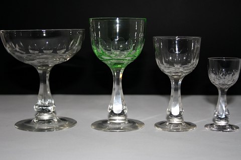 Derby glas, produceret på danske og udenlandske glasværker, de to store glas er fra ca. 1900-20, rundslebet i bunden og med den tids skavanker: