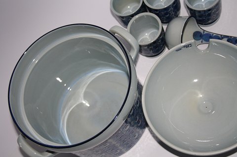Aluminia, Tenera serien. Design: Grete Helland-Hansen. Punchbowle med låg og ske. De 2 krus er solgt kun 1 der er limet i foden se ekstra foto. Højde med låg 24 cm. Diameter uden ører 22 cm. Krus nr. 471/3292. Låg nr 448/3271. Fin stand. Samlet pris: 750 kr.
