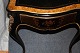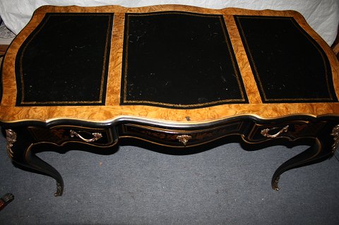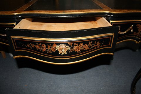 Smukt skrivebord i nød, sortlakeret med guldstafferinger og buede ben med guldsko. Der er 3 læderfelter på bordpladen og 3 skuffer. Skrivebordet stammer fra D'Angleterre. Mål 125x65, højde 78 cm.