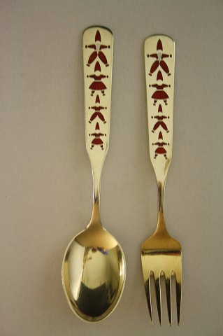 Uldgarnsnisser juleske og gaffel 1957,designet af Erik Ellegaard Frederiksen. Pris: 800 kr. pr. stk. skeen solgt