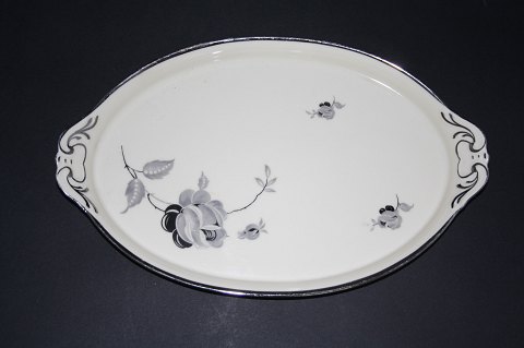 Kjøbenhavns Porcellains Maleri, Sort Rose med platinkant, Bakke til sukker og fløde. Længde 29 cm. Bredde 18,5 cm. Pris: SOLGT
