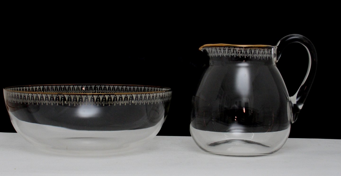 Jordbærsæt. Skål. Højde 7,5 cm. Diameter 21 cm. Kande. Højde 15 cm. Jordbærsæt. Pris: SOLGT