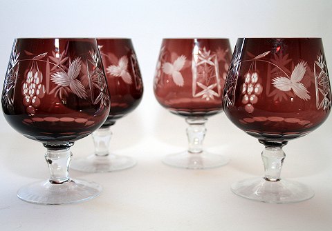 Bøhmisk krystal. Bordeauxfarvede cognacglas. Højde 13 cm. 4 stk. Det ene med indvendigt afslag, se ekstra foto. sælges samlet. Pris: 350 kr.
