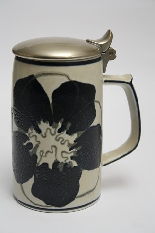 Royal Copenhagen kunstfajance krus med tinlåg af Just Andersen. Kruset er designet af Ellen Malmer. Deknr. 697-3697. I. sortering. Højde 15 cm. Øvre diameter 7,5 cm.