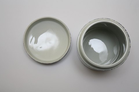 Nymølle fajancefabrik, Bjørn Wiinblad krukke med låg med blå print. Højde 9,5 cm. Diameter 9 cm.